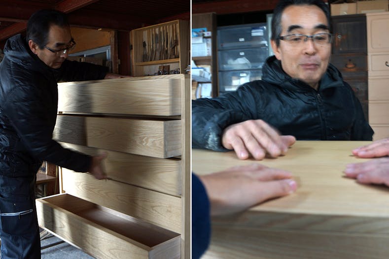 左:引き出しを閉めるのにコツが要るのは、密閉性が高い証拠。右:肌触りにノックアウト