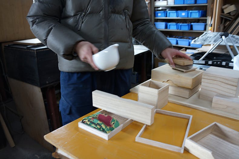 工房でお持ちの箱サンプルをとっかえひっかえ