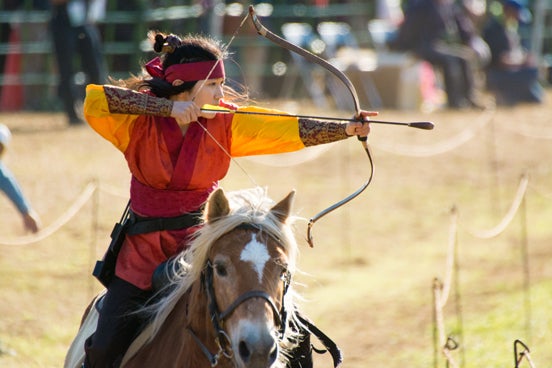 日本では唯一の「騎射競技大会」です。日本の和弓ではなく、短弓を使った馬上の競技です。古代の高句麗壁画に描かれている武芸鍛錬のひとつです。