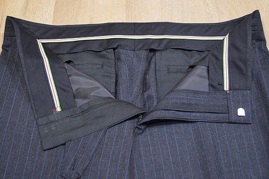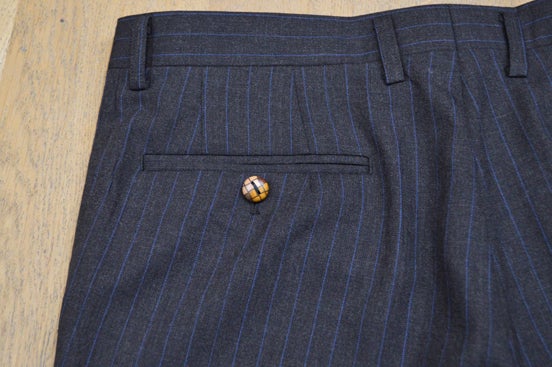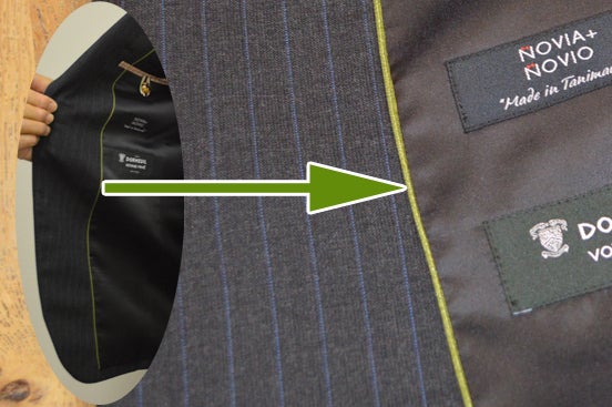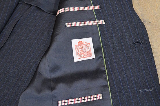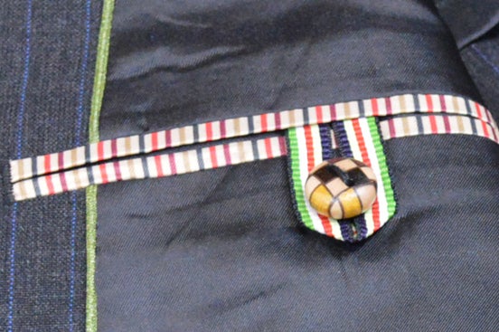 ▲右内ポケットには小田原の伝統工芸品寄木細工のボタン、ボタン留めには五色のリボンをあしらいました。弊社の大阪谷町工場で縫製したスーツのみに着く「Made in Tanimachi」ネームも。