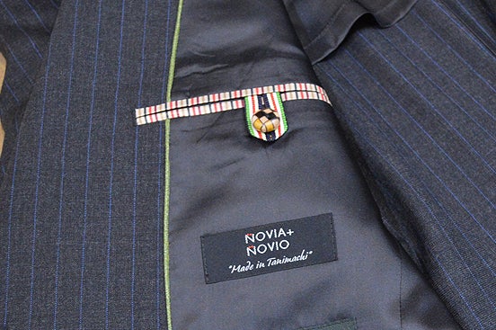 ▲NFLのブランド「Made in Tanimachi」 ブランドネームにはNFLの自社ブランド「NOVIA+NOIVO Made in Tanimachi」を使用。大阪のものづくりへの思いを込めています。株式会社NFLが運営する紳士服・礼服のお店「ノービアノービオ」で採寸の上、生地やオプションをお選びいただいて制作いたします。お好みのスーツ作りを是非お楽しみください。