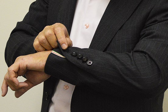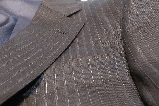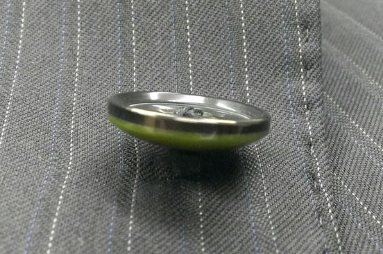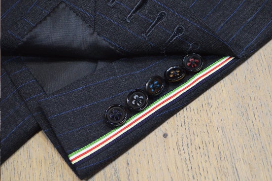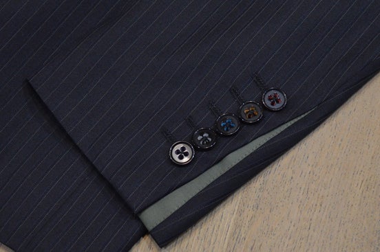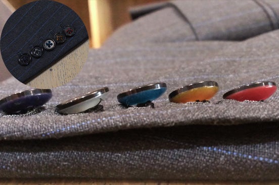 ▲パッと見は普通の袖ボタン。でもスーツには珍しい5つボタン。横から見ると、実は五色備えの色に塗り分けられています。 黒は紫系で代替しています。