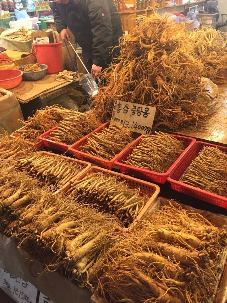市場の様子ですが、ここは日本と違い漢方が多く並んでいてニンジンやニンニクなどが