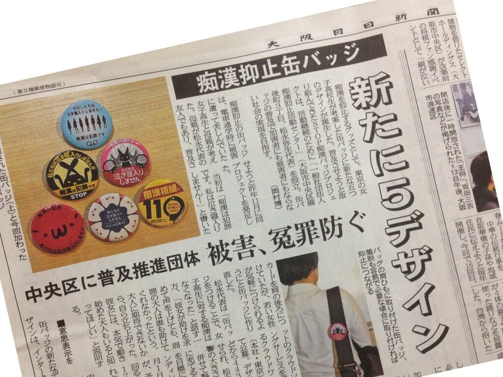 本日(2/16)の大阪日日新聞に、痴漢抑止バッジの記事が掲載されました。