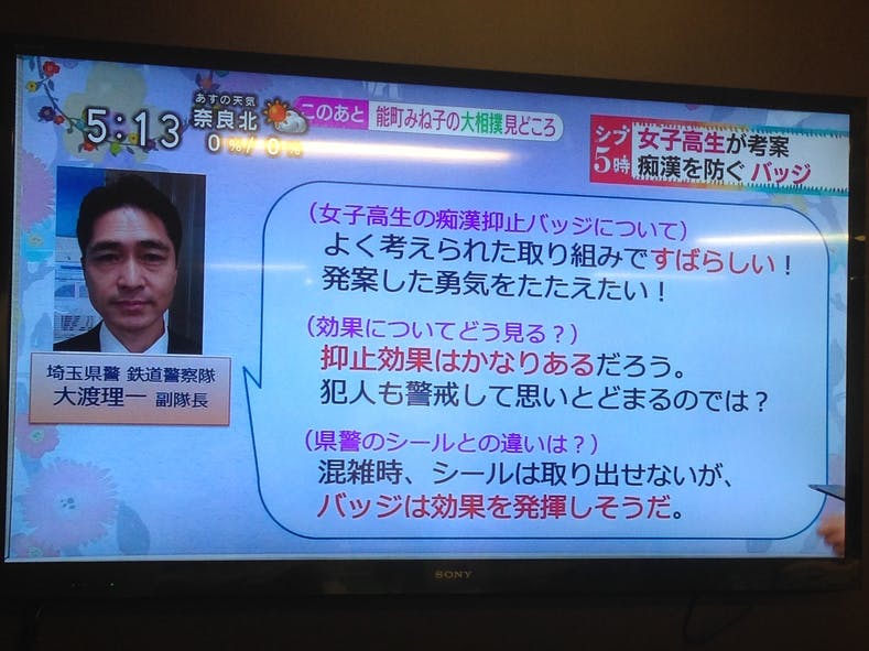 私達、Stop痴漢抑止バッジプロジェクトは、昨秋にクラウドファンディングを開始した際、NHKのシブ5時で取り上げていただきました。その時、NHKが埼玉県警 鉄道警察隊へ痴漢抑止バッジへのコメントを求めました。鉄道警察隊内部で意見を交わしたうえで、