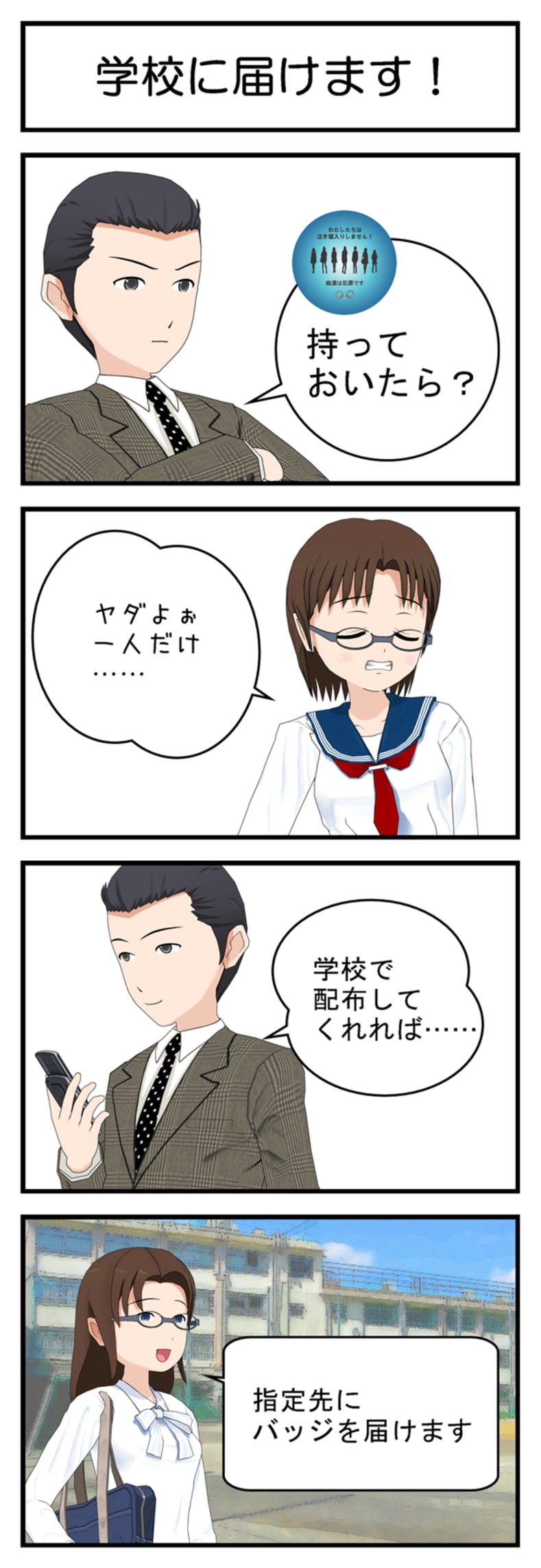 そのような保護者の方に代わって、私たちが学校に痴漢抑止バッジをお届けいたします。