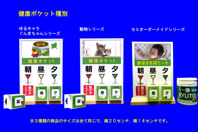 2015/11/30 06:43ぐんまちゃんの健康ポケットは、薬やサプリメントの飲み忘れや2度飲みなどで困っている人々の服薬管理をお手伝いする健康サポートグッズです。 未病という言葉をご存知の方もいらっしゃると思いますが、病気と言うほどではないけれど、健康でもない状態のことで健康診断や、検査などで異常がなくても、自覚症状がある場合は、未病の状態である可能性があると言われています。このような未病を感じられていてサプリメントを服用されている方や医師から薬を処方されている方の健康生活をお手伝いします。使用対象者としては、年齢に関係なく自分で薬の管理が可能な方となります。自分で管理できない方でも、ご家族など同居される第三者の方が管理していただける場合は、ご活用いただけます。 もっと見る