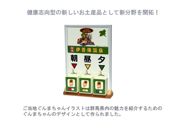 ご当地ぐんまちゃんイラストは群馬県内35市町村の魅力を紹介するためのぐんまちゃんのデザインとして作られました。商品デザインに、ゆるキャラのぐんまちゃんイラストを使用することで毎日、朝昼晩の三度、薬を飲むたびに県内観光地等の魅力を目にすることになるため自動的に宣伝効果が発揮され魅力度ランキングの低い群馬県のイメージアップに貢献します。