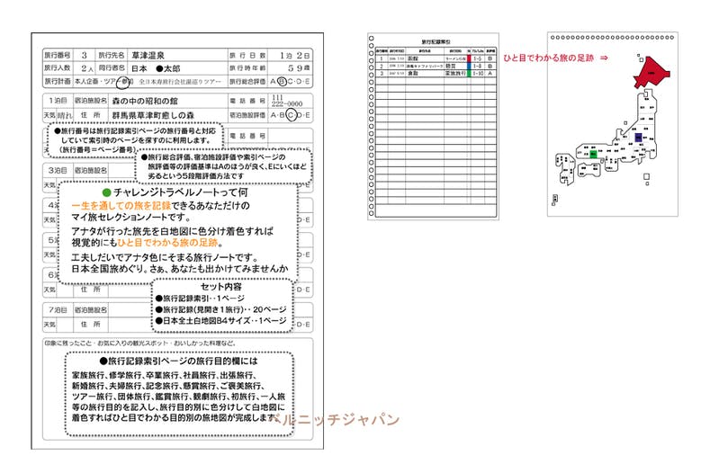 チャレンジトラベルノートの特長は、付属している日本全土白地図に今までに旅をしてきた都道府県を一つ一つ塗りつぶしていき、空白のままになっている都道府県を眺めることで『次はこの県に行ってみよう』という楽しみをもつことができるということです。つまり、一つ一つ白い部分を塗りつぶしていくたびに、全国制覇というワクワクとする目標達成感や充実感を感じることができる目標達成型チャレンジ旅行ノートで、使う人によって色々な活用方法が生まれる汎用性の高い旅行ノートです。