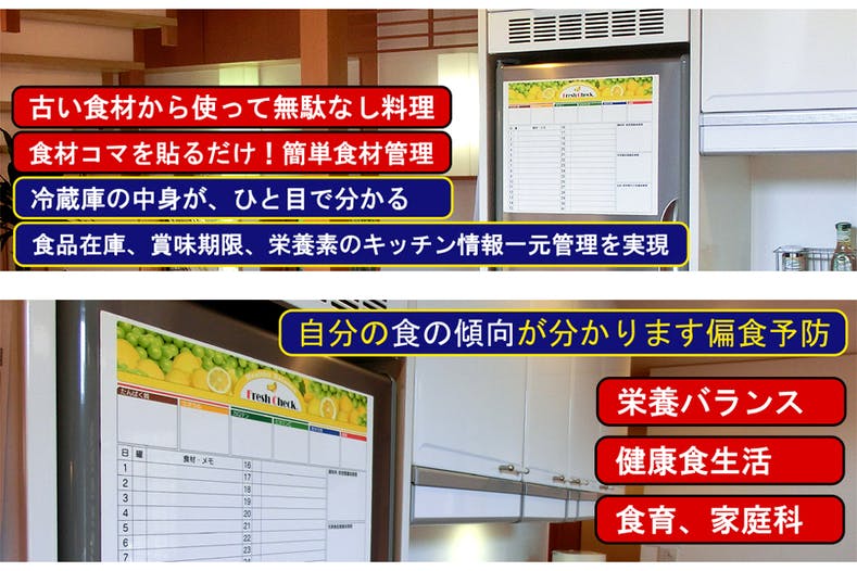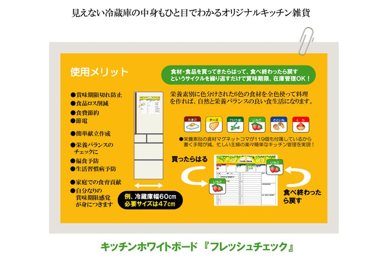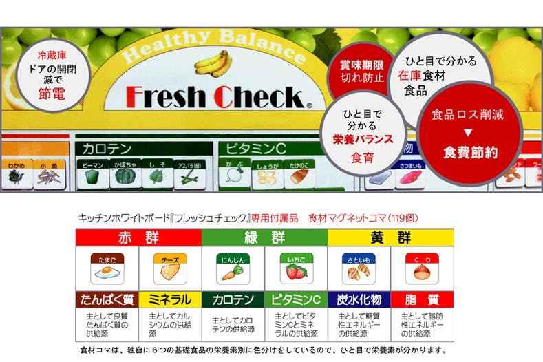 冷蔵庫のドアを開けなくても中身がひと目で分かるので、『あっ!忘れてた』が無くなり、食品ロスを減らします。カレンダー方式になっているマグネットシートタイプの本体に、栄養素別(6つの基礎食品)に色分けされた食材、食品のイラストのマグネットが付属していて、キッチンや冷蔵庫内の食材、食品の鮮度管理(賞味期限チェック)や在庫管理、栄養バランスなど、食材、食品情報が一元管理できる仕様になっています。