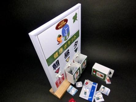 健康ポケットは、使用者本人はもとより、家族や第三者の方が見てもひと目で、その服用状態が分かるように独自の工夫がされています。朝昼夕と印刷された3ヶ所のところにあるフックすべてにポケット箱が吊り下がっている場合は、一度も服用していない状態を示しており、朝昼夕の薬を飲む時間に該当するポケット箱を本体ボードから外すと、ポケット箱の後ろに隠れていた『朝昼夕の分のみました』のそれぞれの文字が現れる仕組みになっていて、使用者をはじめ、家族や第三者の方が服用状態をひと目で確認・把握することができます。