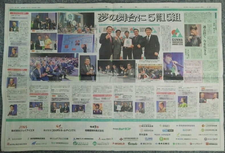 Faavo群馬をご覧の皆さんへ、続報です。 12月5日に群馬県前橋市で開催された群馬イノベーションアワードの様子が、今日(12月23日)付の上毛新聞に特集されていますのでご覧ください。 群馬県外の皆さんにも、このレポートにて紙面を一部ご紹介します。 上毛新聞を手にして紙面を開くと、見開きにドーンと大きく紹介されていました。 すごい迫力です。主催した上毛新聞さんの意気込みが伝わってきます。 左上の方に弊社代表 佐藤高生が写っていますね。 左側のプレゼンターは群馬県商工会議所連合会の曽我会長(前橋商工会議所会頭)です。 実は、曽我会長は佐藤の大学の大先輩にあたります。外資系企業で飛び回っていた佐藤が前橋を創業の地として選び、偶然とはいえ先輩後輩がこのような形で、地元前橋で再会できるのも運命的なものを感じたそうで、「曽我大先輩からトロフィーを頂戴できたことが一番嬉しかったよ」だそうです。 そして、上毛新聞11面の上段には、当日登壇したファイナリスト達の集合写真です。佐藤は中央よりやや右側で賞状を手にしています。 なんだか、佐藤の黄色いユニフォームが目立ちますが!?(このユニフォームについては後ほど。。。) 佐藤は「スタートアップ部門」賞を受賞したものの、各部門から更に与えられる「大賞」は前田設備さんに奪われてしまいました。会場では【パブセン】が「大賞」を逃した際、驚きの声が上がりました(と感じられました(笑))。 それも、そのはず!これをご覧ください。 国領審査委員長も講評の中で、前田設備さんと佐藤のプレゼン【パブセン】のどちらが「大賞」となるべきか審査委員の間で激しい審議があったと明かしています。 そして、【パブセン】は「大賞」に匹敵する「特別賞」を頂戴することとなりました。 最後に、上毛新聞紙面上の佐藤【パブセン】の記事をご紹介します(11面下段)。 終始目立っていた、黄色いユニフォームの佐藤の胸には【パブセン】の特許出願技術「Life Weaver Technology」アンバサダーのシルコちゃんが! プレゼン、授賞式などで大型スクリーンに佐藤が映るたびに、会場から「かわいいっ!」の声があがり、私たちはちょっと違和感を感じるのでした(決して、佐藤がかわいいわけではないのは承知していますが(笑))。 さて、そのシルコちゃんですが、Faavo群馬で【パブセン】をご支援いただくともれなく入手できます。 今回限定デザインのシルコちゃんTシャツ(共同設立支援者「コ・ファウンディングサポーター」)を、この機会に是非ゲットしてくださいね!