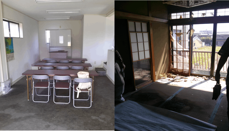 ▲1階はワンフロアで以前塾だった名残があります(左)2階の6畳間は雨漏りで畳が腐ってしまっています。壁もかなりぼろぼろです(右)