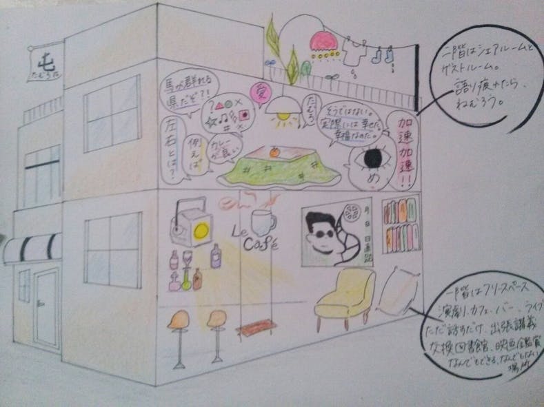 ▲たむろ荘のドリームイメージ。1階はワンフロアなのでイベントスペースに、2階はシェアルームとゲストルームに改装予定です。