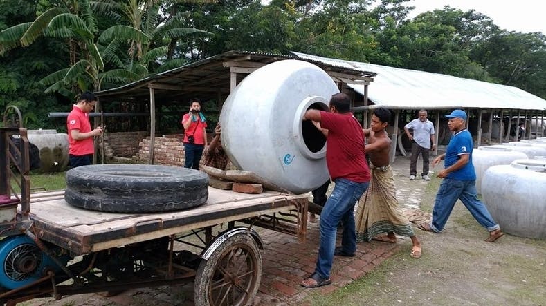 雨水貯留タンクを設置中です。タンクは1000リットル貯蔵でき、重量は250キロにもなります。電動リキシャで設置家庭まで運びます。