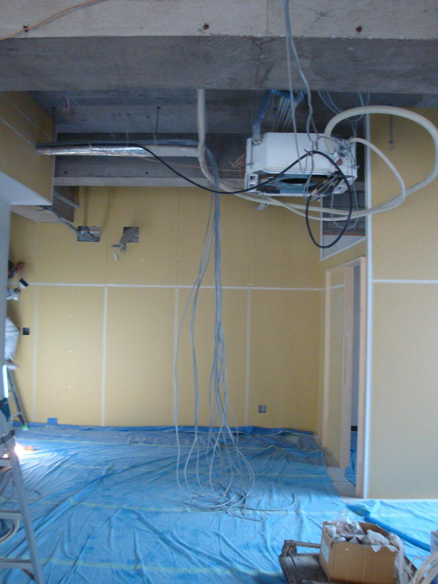 こんな感じで、室内をスケルトン状態にして電気関係の配線や壁面の処理を行います。
