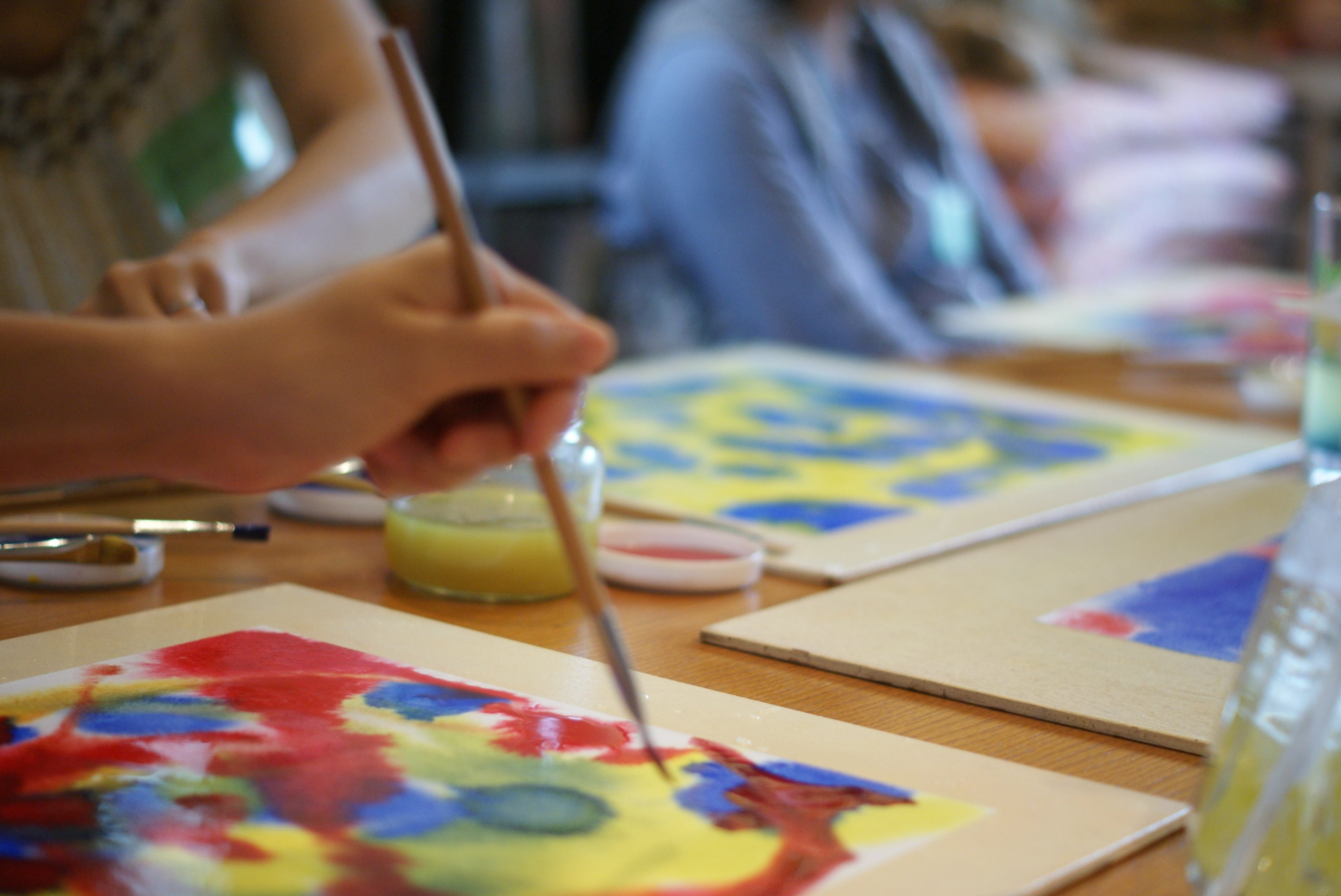 ▲にじみ絵ワーク。うまく描こうとせず、感覚で選んだ色を落としていく。シュタイナー教育でも取り入れられている。