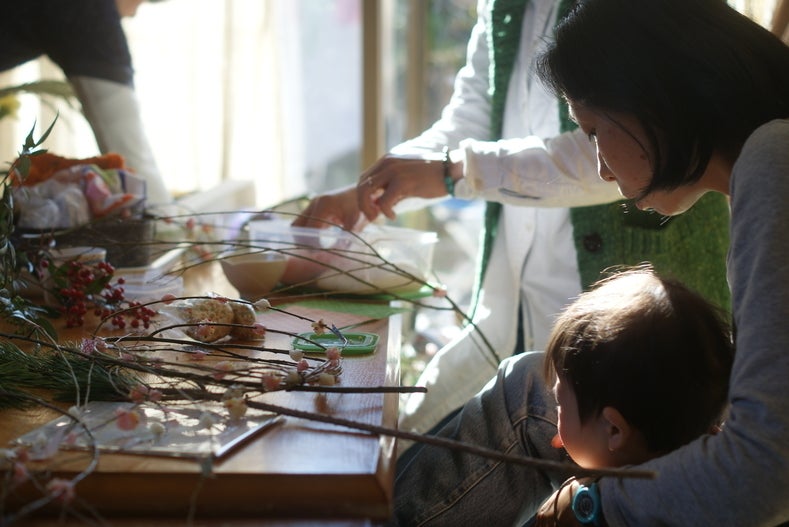 ▲季節の手仕事を親子でたのしむ「こよみどり部」。お正月にむけて餅花づくり