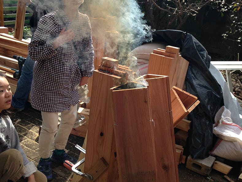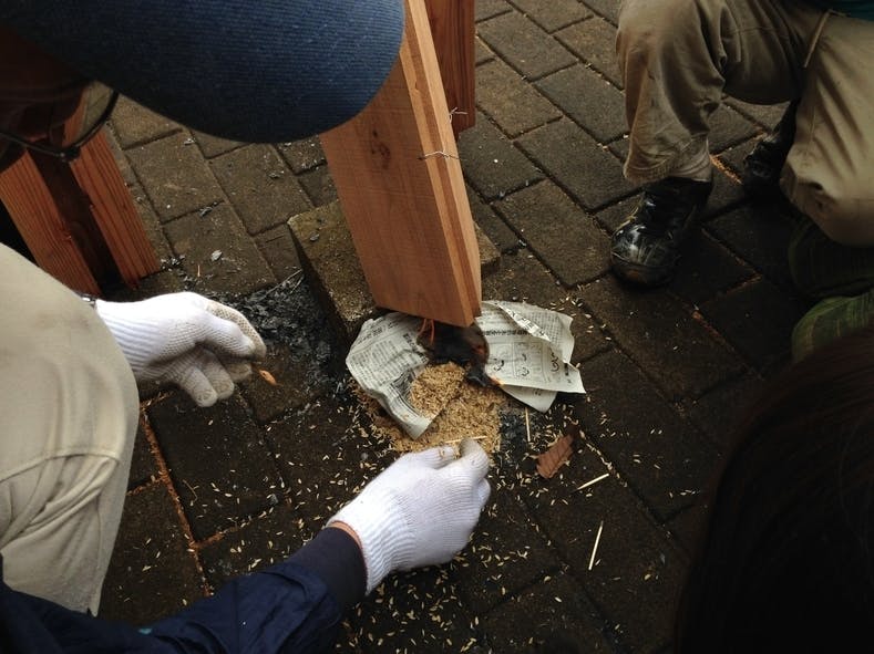 筒状になった杉板の下に、新聞紙やもみ殻(ここでも活躍!)を燃やします。