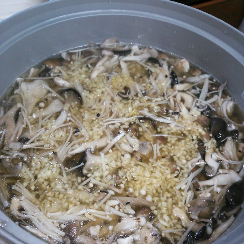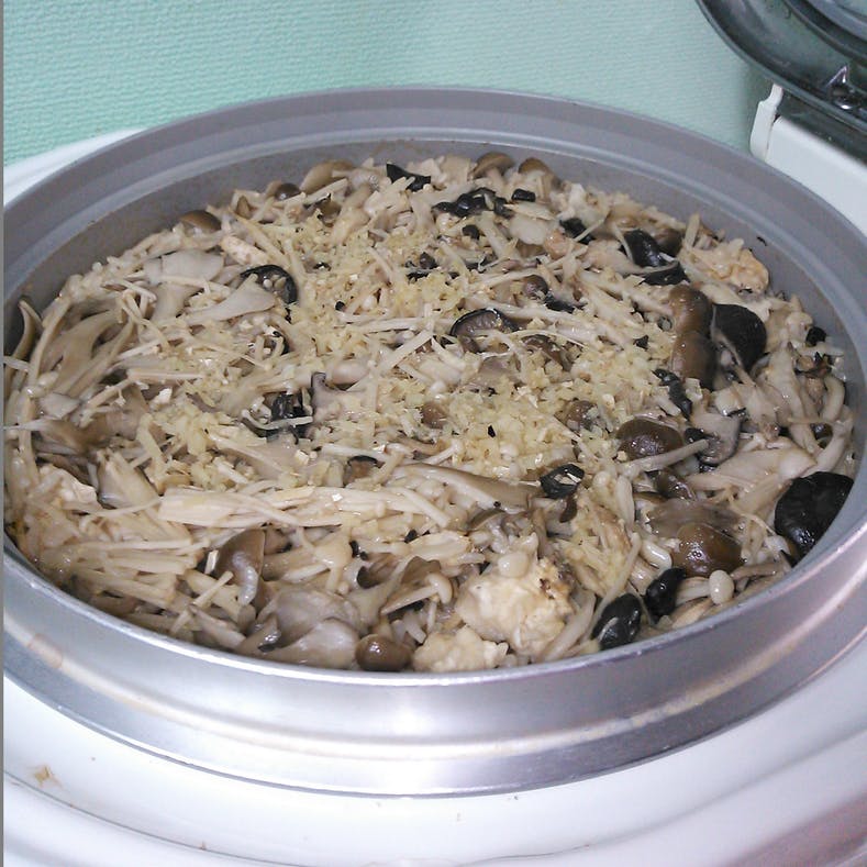 グリルしたキノコたちとショウガのみじん切り、醤油をいれて炊きます。