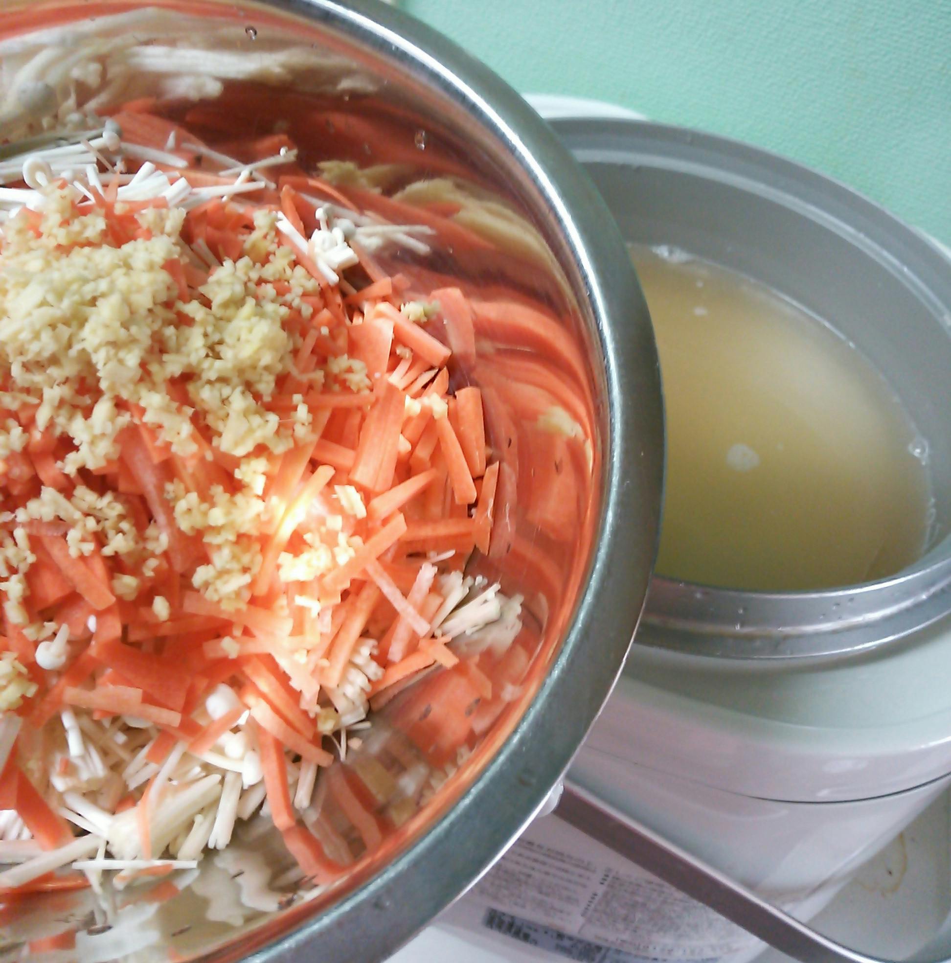ニンジン、えのき、お揚げは、同じくらいの長さの千切りに。ショウガはみじん切りし、醤油を入れてこちらも炊きました。