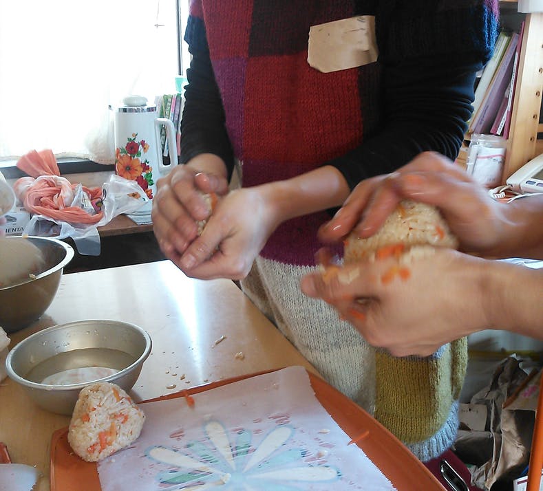 炊きあがった後、スタッフ総出でおにぎりにします。