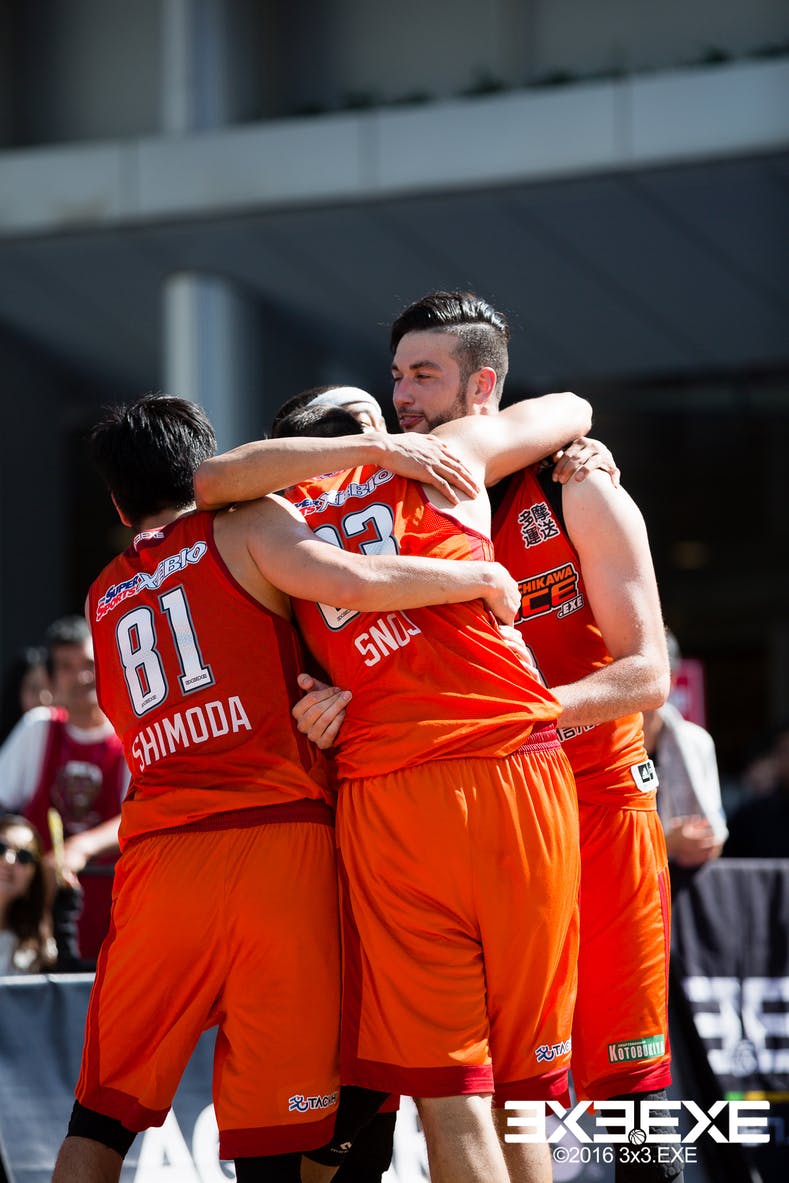 初めてブレックス栃木に勝利し、思わず抱き合う選手達。
