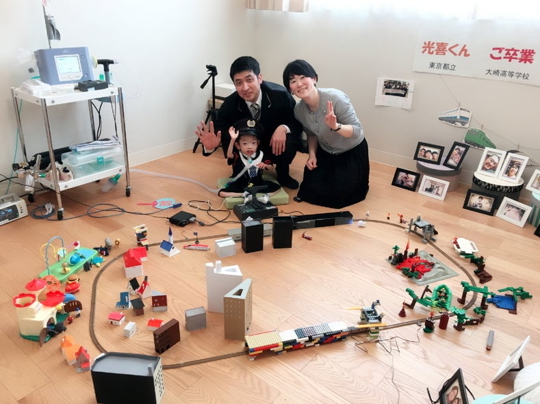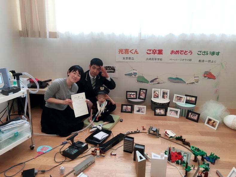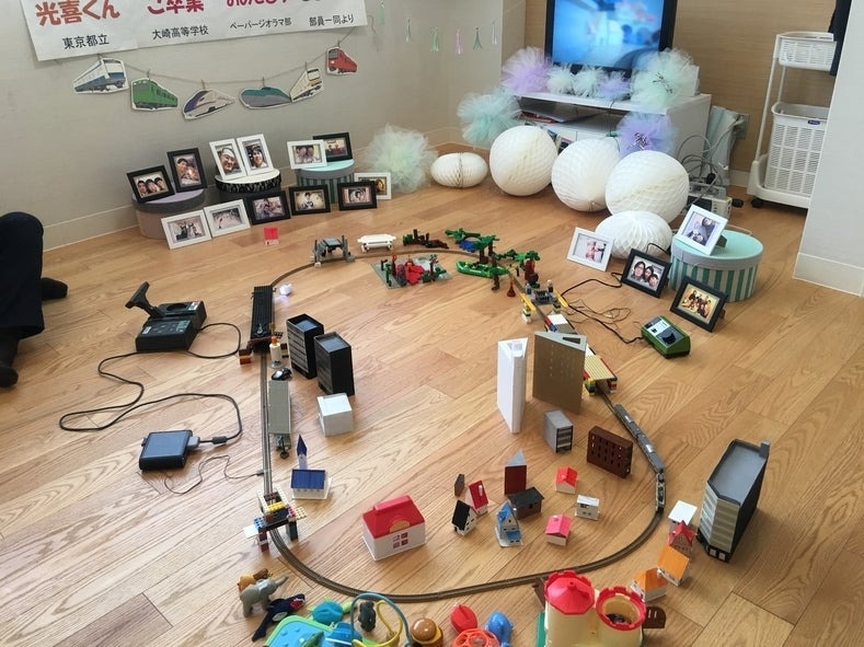 病院の一室を可愛い飾り、Nゲージ、大崎高校ペーパージオラマ部の皆さんが作成したジオラマ、お兄ちゃんがレゴ作ったジャングル、トンネルなどを使って、あっというまに「非日常」空間になりました。