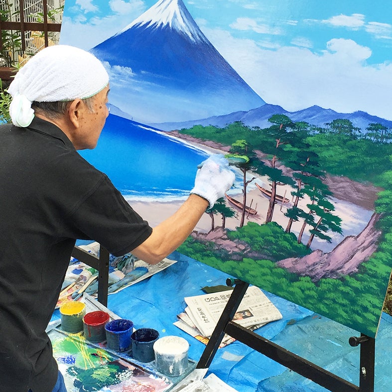 1人は、日本に3人しかいない銭湯背景画(ペンキ絵)絵師の1人、丸山清人さん。80歳の今も銭湯背景画の絵師として活躍されている丸山さんは、実は鳩の湯と同じ国立市内にある矢川という地域にお住まい。鳩の湯の現在のペンキ絵は丸山さんが描かれた富士。今回、ライブペインティングの形で多くのお客さんに見ていただきながらペンキ絵を更新することにご快諾いただきました。