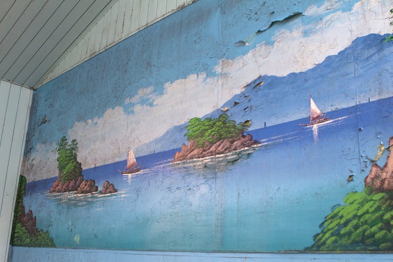 鳩の湯を訪れる度に気にかかるのが、やはりペンキ絵。近くで見ると結構カビてしまっているし、ペンキが捲れ上がり、剥がれてしまっている。毎日長時間湯気にさらされる為、このこと自体は必然なのですが、やっぱりきれいな状態にしてあげたいです。