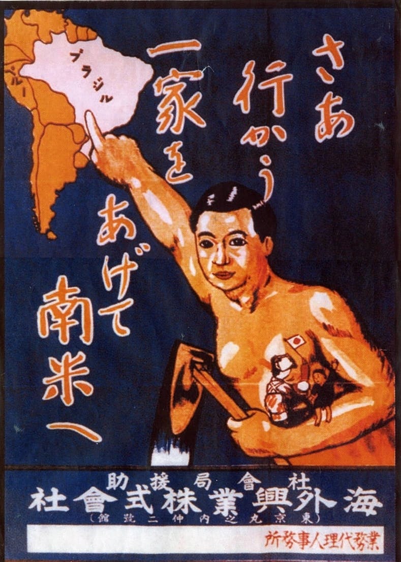 Em meados de 1920, como forma de medida para solucionar problemas sociais internos causados após o terremoto de Kanto, o governo, passou a se concentrar nos negócios de imigração para a América do Sul, iniciando o subsídio dos custos de viagem ao Brasil. Na época este poster foi utilizado como propaganda de recrutamento.