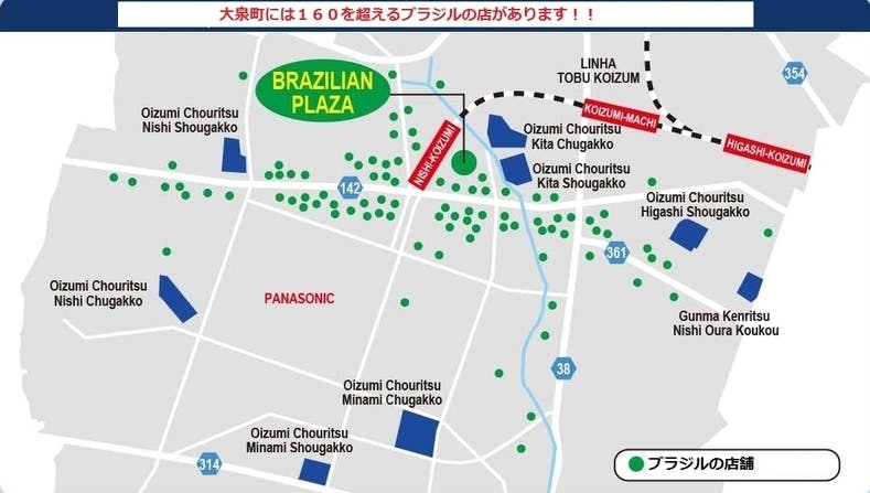 A cidade de Oizumi onde está situada o Brazilian Plaza, possui uma população de 42 mil habitantes, dentre estes, 6 mil são estrangeiros, ou seja 16% da população é composta de estrangeiros. Esta é a proporção mais alta do Japão. Quando se 「anda pelas ruas pode-se encontrar uma grande quantidade de estrangeiros」, se pode afirmar que dentre 6 pessoas uma é estrangeira. Há muitas lojas brasileiras e realmente mais de 160 estão em Oizumi. É realmente um pequeno Brasil !!