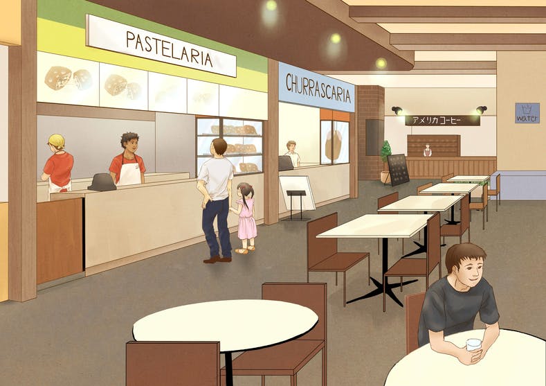 南米(ブラジル・ペルー・アルゼンチン・ボリビア)の料理を提供する店舗が入り、それぞれが軽食を提供します。1回の食事で様々な国の料理を楽しめます。また、フードコート内にはステージも用意。南米特有の踊りや音楽を楽しみながら食事ができます。