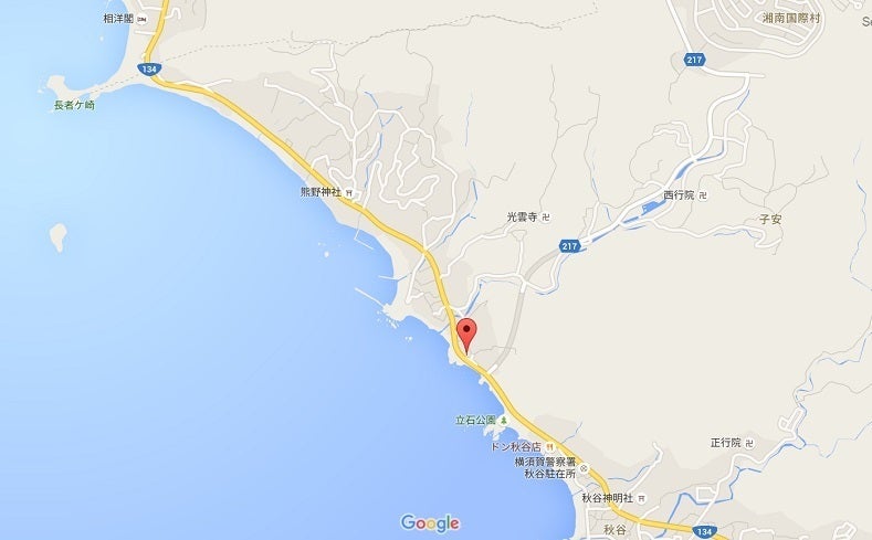 逗子ICから逗葉新道へ入り、料金所を出て最初の信号「南郷トンネル入口」を左折、道なりに直進し、国際村を経て海岸沿い134号を右折するとすぐの場所です。