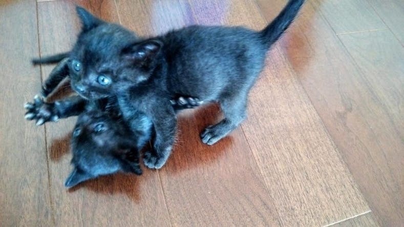 猫の名前はリリーとマリー(1歳2ヶ月の姉妹・雑種)です。生まれた日に川に投げ捨てられました。偶然、その現場を目撃した人(私)がいて拾われ、今は家猫として暮らしています。