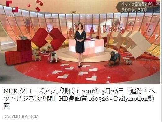 また、”社会の声”も確実にその方向に向かっていると感じています。その一例が、5/26に放映されたNHK クローズアップ現代の番組です。「追跡!ペットビジネスの闇」と題して、ペットに関する社会問題が映し出されましたので、ここにご紹介させていただきます。