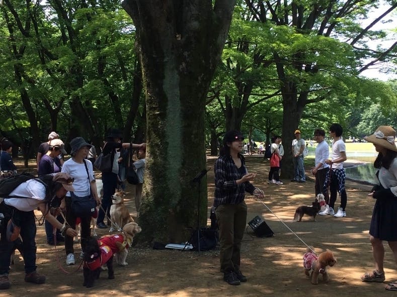 10時30分。代々木公園の噴水周りに約100人の参加者と30匹あまりの犬たちが集まりました。Dog Shelter代表は開会の挨拶で「最近の猫ブームによって、犬のブリーダーが経営破綻に陥り、犬の引き取りが増えています。今日は、破綻したブリーダーから引き取った保護犬も連れてきています。」と最近の傾向を紹介しました。