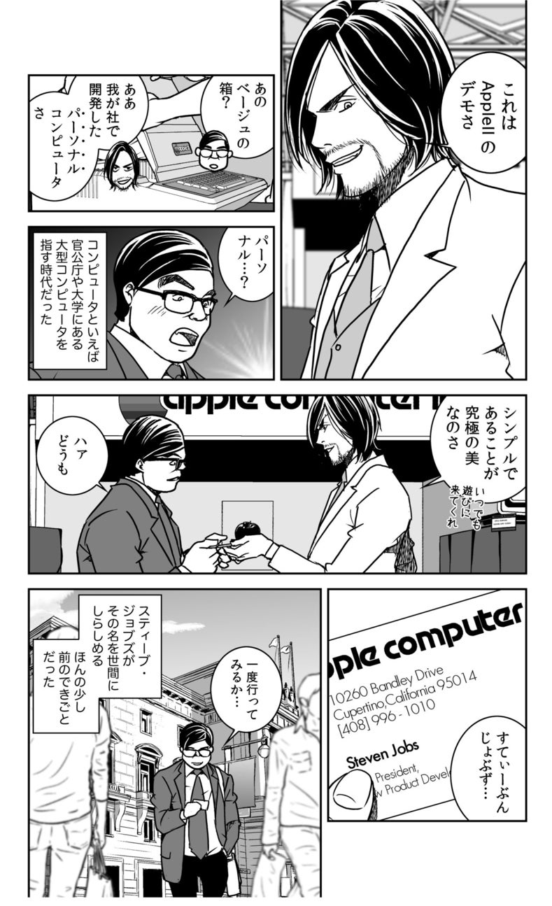 読みやすい形といえばマンガだろうということで、いま小学館のビックコミックスペリオールで『スティーブズ』を連載しているうめ先生に作中の名シーンのマンガ制作を依頼することにしました。うめ先生、ご快諾ありがとうございます。
