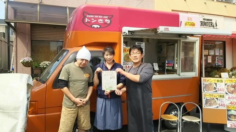 っていったらキッチンカーの目立つとこに貼ってくれることになって、その上このプロジェクトに支援までいただいてしまいました。