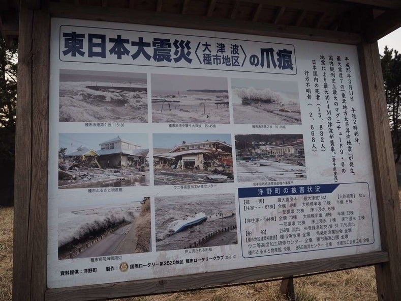 洋野町では人的被害はなかったのですが、民家をはじめ、船7隻、漁協事務所などが流され、最大の被害を受けました。また、昭和から続くウニの溝式養殖施設も破壊されました。