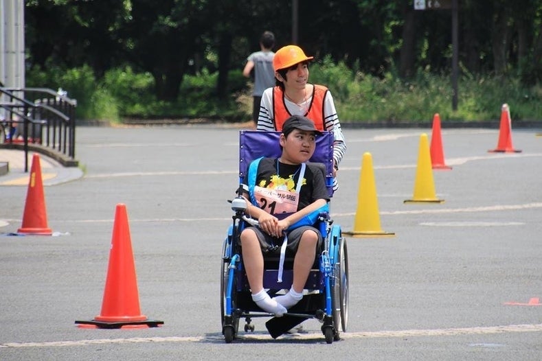 ▲オレンジ色のビブスを付けたチームリーダーと車いすランナーの少年