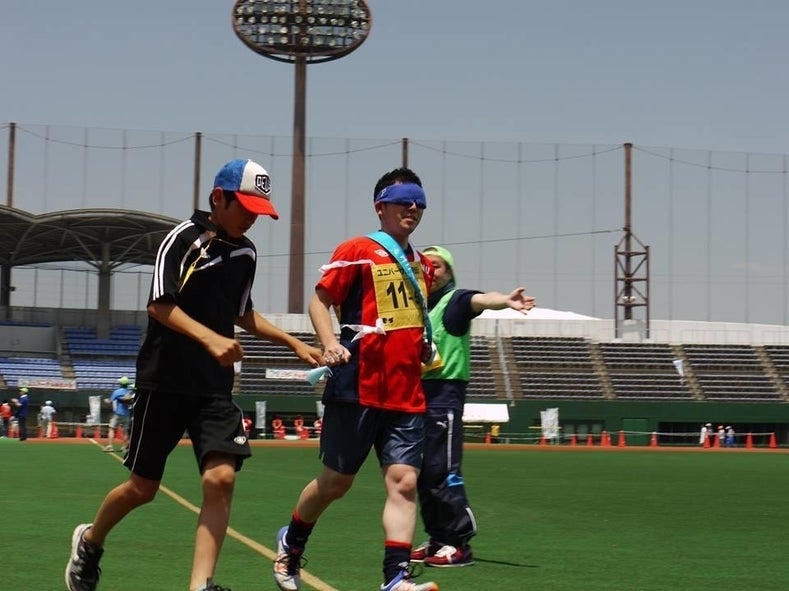 ▲アイマスクの選手の伴走をする伴走サポーター。緑のビブスは走路担当のボランティアスタッフ。
