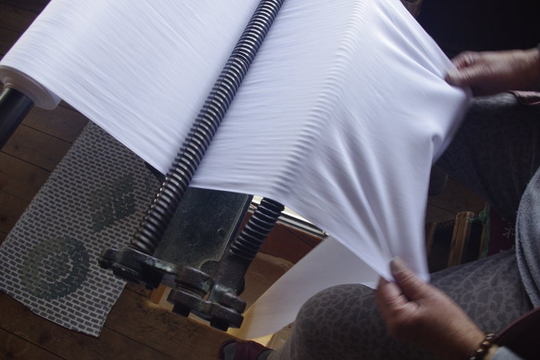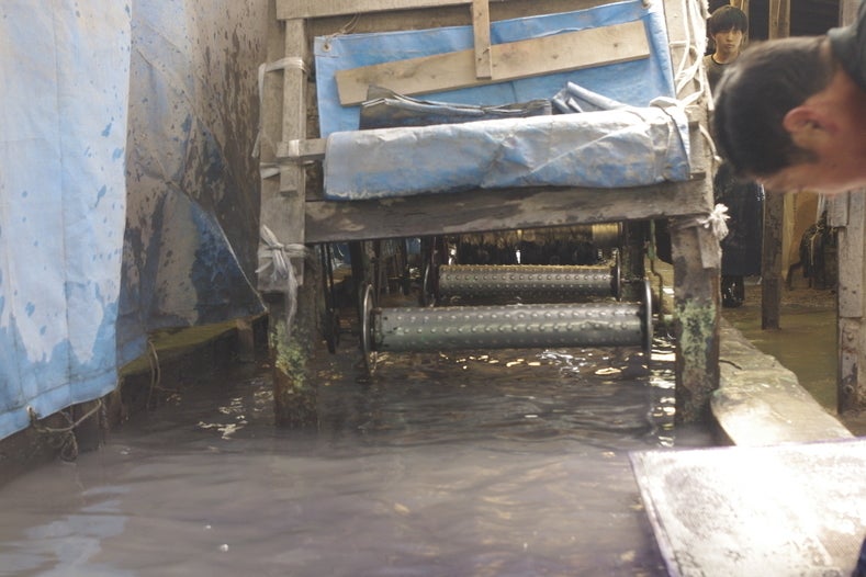 洗うことで、塗ってあった糊や、余分な染料を落とします。ここでは唯一機械を使っていますが、最後は人の手で脱水機にセットします。