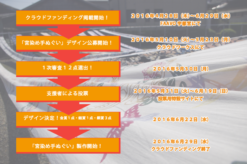 今回皆様にいただいた支援金は、宮染めが世の中に受け入れられ易い様に、デザイン案の募集費用と、宮染め手ぬぐいの製作に使わせて頂きます。