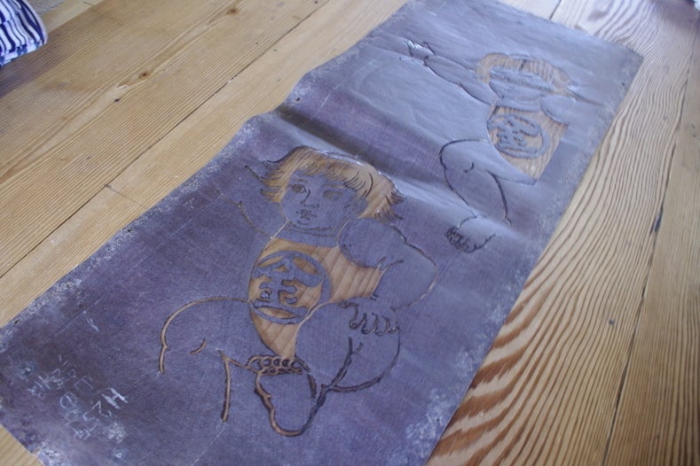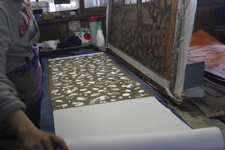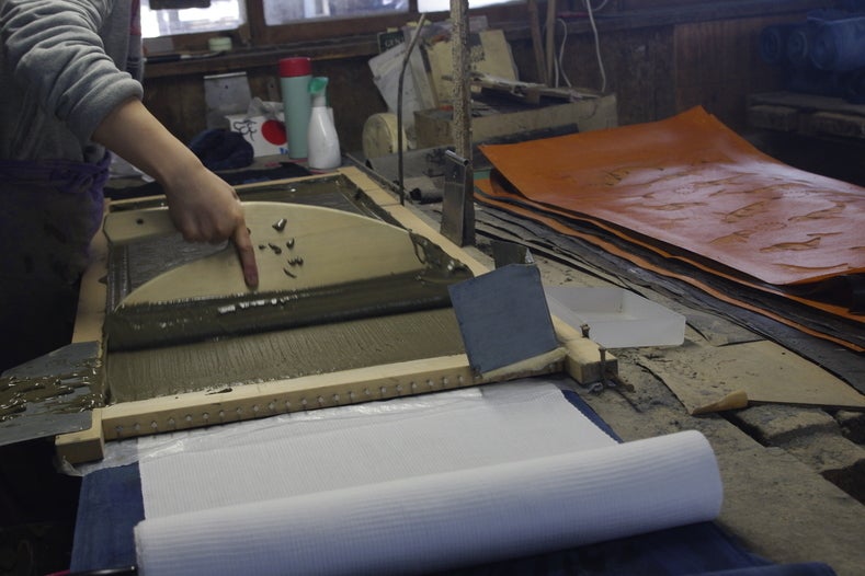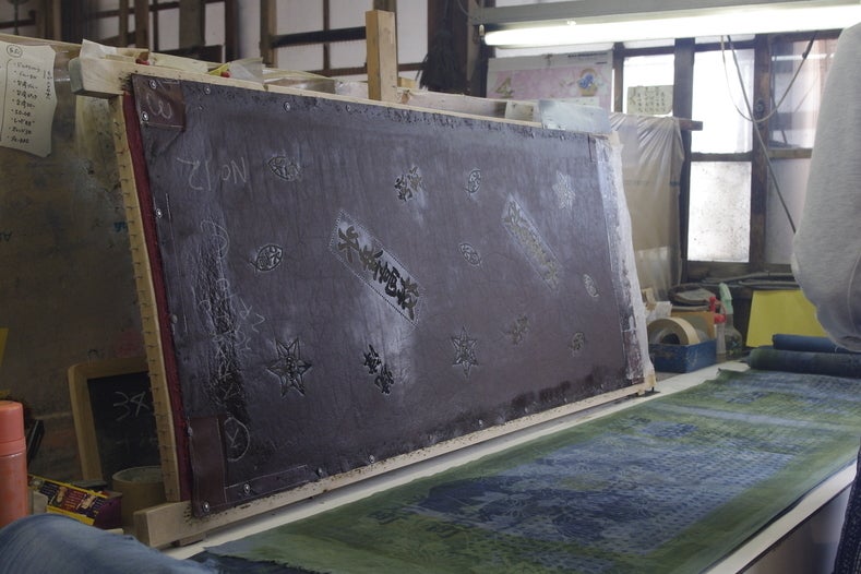 染料を注いで染めるので、注染(ちゅうせん)と呼ばれます。また、写真に見える枠囲いをしている土手は、染める際の模様同士の間に余白ができる様に塗られています。これをすることで、異なる色が混ざらない様に工夫されています。