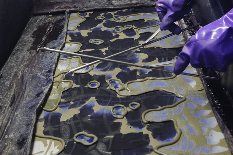 [4]型紙に生地をセットし、染める
