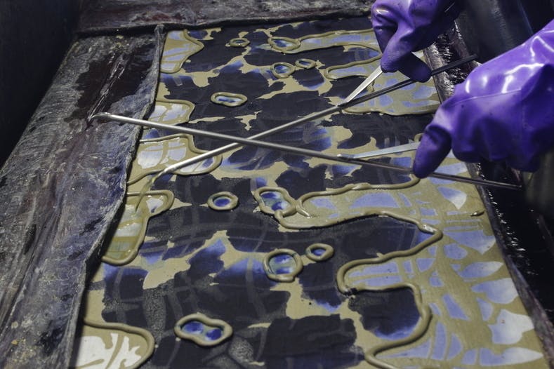 [4]型紙に生地をセットし、染める