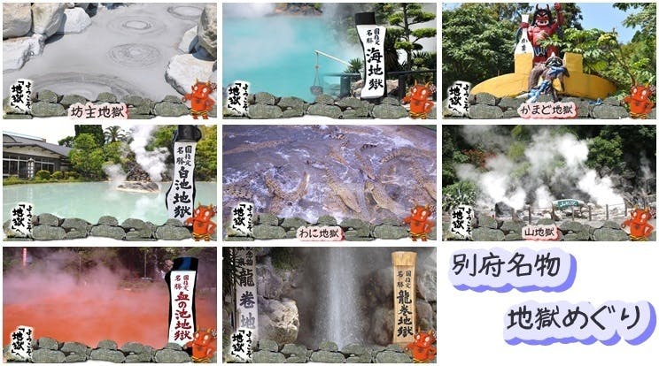 別府に行ったことのある方はご存じと思いますが、別府市内には『地獄巡り』というものがあります。市内に点在する海地獄、鬼石坊主地獄、山地獄、かまど地獄、鬼山地獄、白池地獄、血の池地獄、龍巻地獄と呼ばれる、入浴ではなく観覧を目的とした八つの源泉が対象であり、これら全てを巡るという観光です。