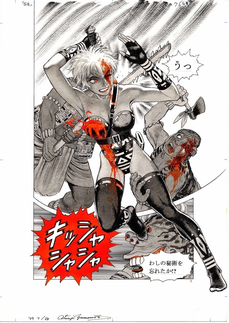同人誌では赤と黒の二色カラーで印刷したものを販売していたのですが、元の原稿(生原稿)は以下のように複数のカラーインクを使って彩色されたものになります。