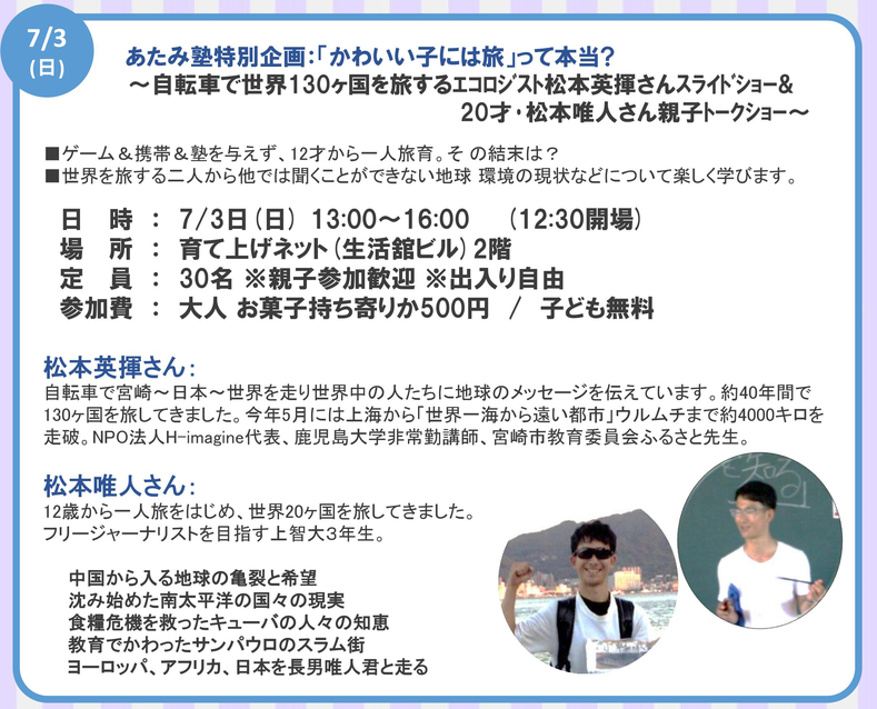 世界中を旅する松本さん親子のトークショーです!すでに多方面からの反響をいただいています!
